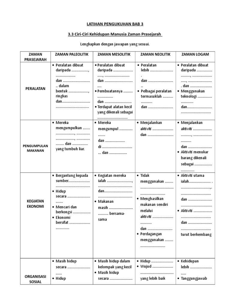 Menjelaskan keupayaan manusia zaman prasejarah meneruskan tersirat kelangsungan hidup. 1 SEJARAH TINGKATAN 1 BAB 3. Zaman Prasejarah - Set 03 Selesaikan.